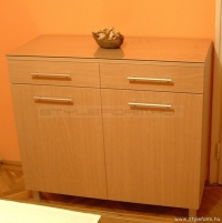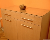 Komód tölgy színű vákuumfóliás felülettel, üveglappal a tetején