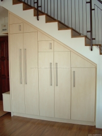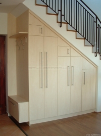 Előszobai lépcsőalatti beépitett gardrób szekrény Mainau nyírfa színű laminált lapból. Szekrény 85 cm mélységű, a belsejében akasztós és tárolós részek találhatóak. Bútorra szerelt fogantyú típusa Forest 00007650880, a fogas típusa Forest 00008820041
